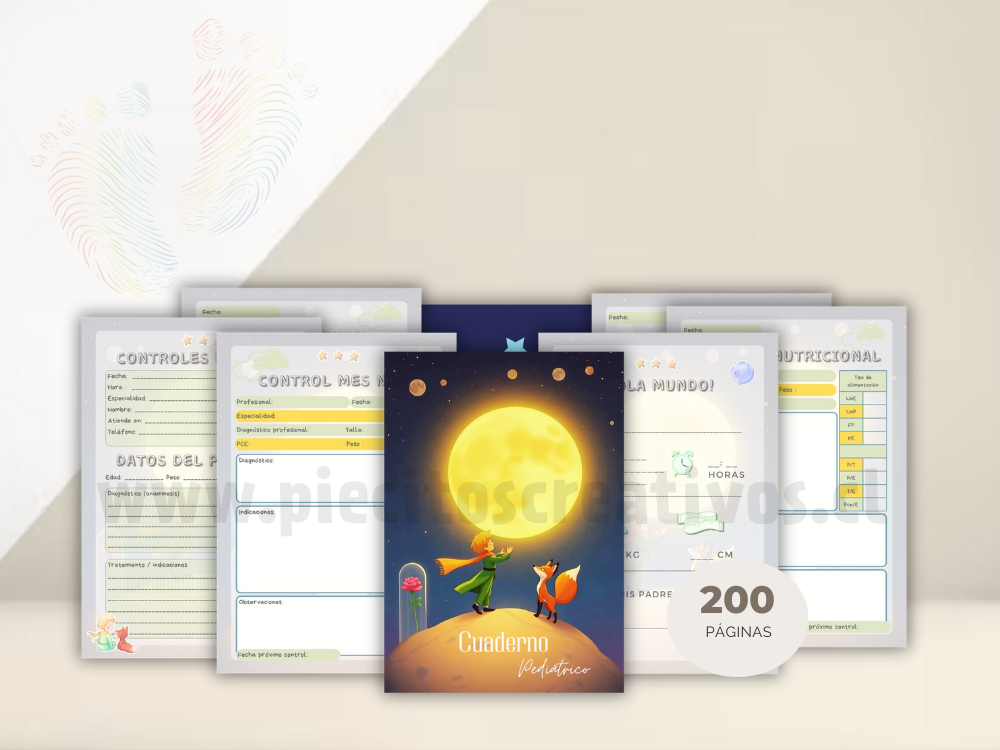 El Cuaderno Pediátrico Niño Principito está diseñado para acompañar a tu hijo desde su nacimiento, permitiéndote registrar cada control médico, vacunas, crecimiento, alimentación, alergias y mucho más. Incluye páginas para recetas, minutas, primeros dientes, controles dentales y citas médicas. Su diseño inspirado en El Principito lo hace especial y único, ideal para guardar los recuerdos más importantes de la infancia de tu pequeño.